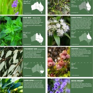 We have signs for the following plants: Anise Myrtle, Lemon Myrtle, Illawarra Plum, Small Leaved Tamarind, Strawberry Gum, Finger Lime, Mountain Pepper, Old Man Saltbush, Cinnamon Myrtle, Prickly Currant, Geraldton Wax, Midyim, Native Oregano, Native Thyme, Muntries, River Mint, Sea Celery, Vanilla Lily, Chocolate Lily, Warrigal Greens, Yam Daisy, White Elderberry, Pigface, Common Appleberry, Sweet Appleberry, Bulbine Lily, Spiny Headed Mat Rush, Flax Lily.